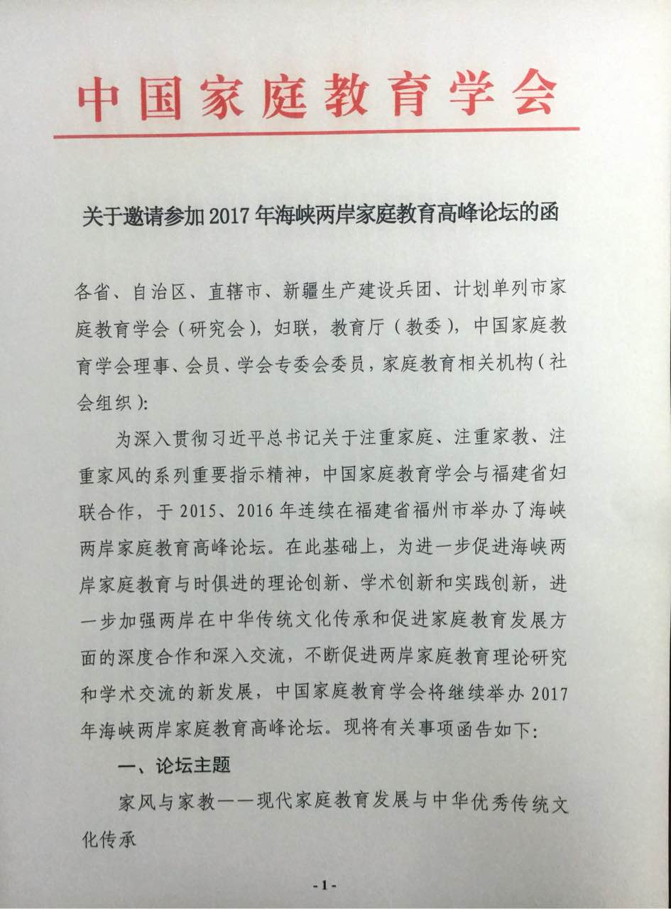 轉發:中國家庭教育學會關于邀請參加2017年海峽兩岸家庭教育高峰論壇的函