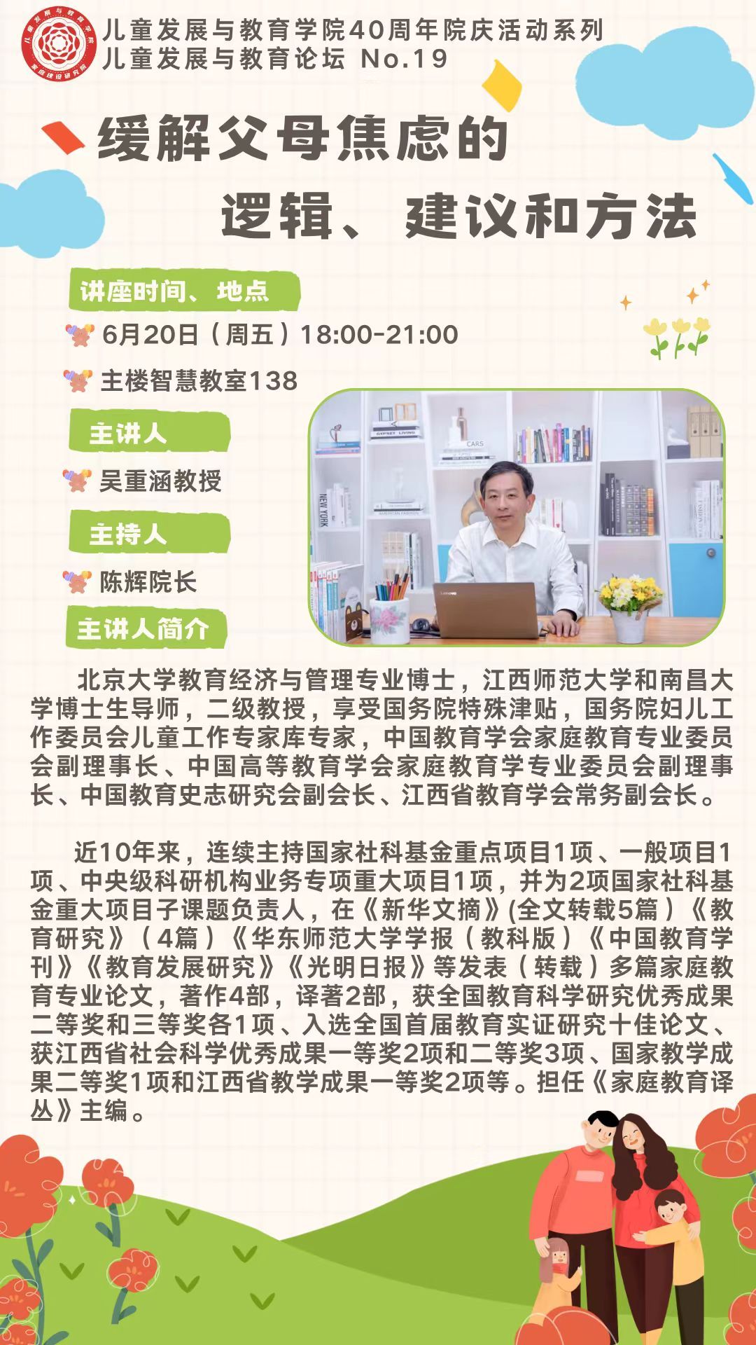 兒童發展與教育學院40周年院慶活動系列兒童發展與教育論壇 No.19:緩解父母焦慮的邏輯、建議和方法