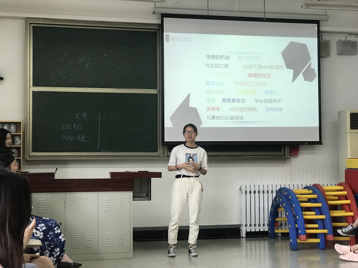 總結(jié)會上,16級每個實習(xí)基地團隊根據(jù)“過程-收獲-反思-分享”的主題進行了詳實、生動的匯報,從為什么選擇實習(xí)點、實習(xí)環(huán)境、實習(xí)過程中做什么、有什么收獲、有什么樣的成長等幾個方面展開敘述,使用視頻、圖片、文字形式展示了自己實習(xí)過程中的愉快、苦惱、應(yīng)對方法,反思了自己以往的一些錯誤觀念,表達了對職業(yè)崗位的逐步理解。各組匯報形式多樣、內(nèi)容異彩紛呈,以下摘取部分同學(xué)的分享: