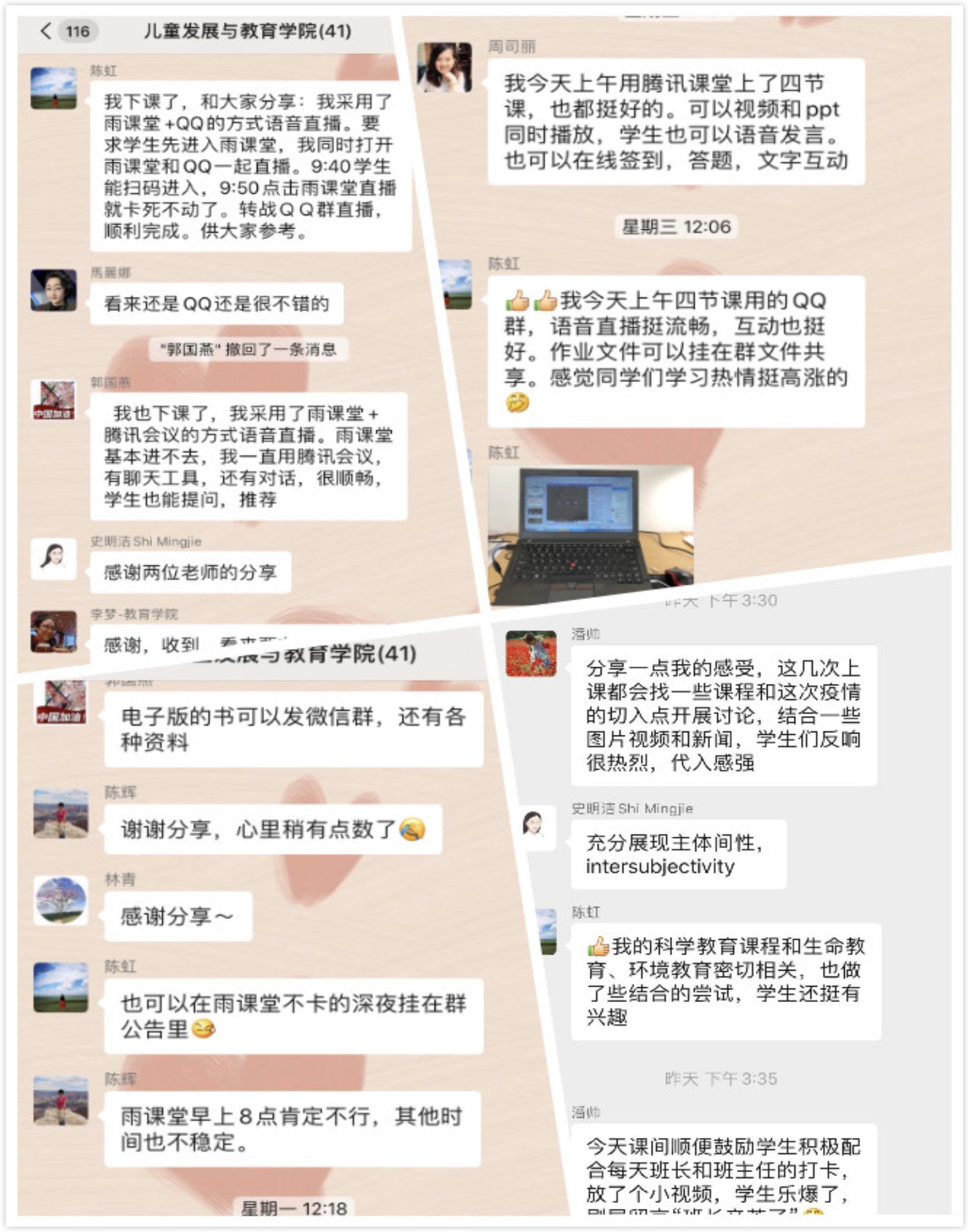在線課程一結束,老師們都會第一時間在學院微信群分享上課情況、經驗、問題以及初戰告捷的激動,給還未開始線上直播的老師極大地信心和鼓舞。大家在一起探討線上平臺的使用技巧,師生互動的方法,共享在直播過程中的感受、經驗和學生的積極反饋。老師們還結合自己的課程和學生討論與疫情相關的問題,在教學中滲透生命教育和環境教育,給學生積極正確的價值引導。每一天都有新的經驗、新的交流,新的反思和想法的碰撞,大家共同探索,相互支持,討論空前熱烈,形成了持續不斷、全天候的在線教學研討活動。