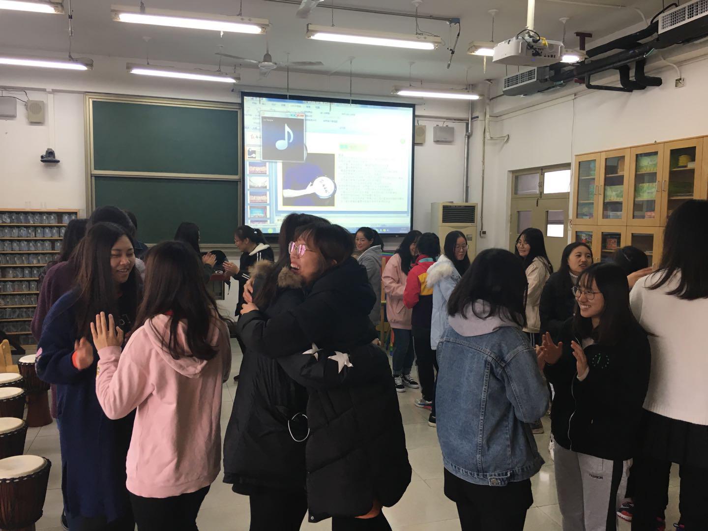 在課堂上,同學們跟隨老師拍打自己的身體和同伴的身體,感受用身體發出“聲勢”,然后一起拉手找朋友、跳圓圈舞,以身體作樂器,像非洲人跳舞那樣感受音樂的律動。在激活課堂氣氛,進入藝術教學環節后,每位同學都拿到一面鼓,大家認識了非洲鼓的低、中、高音部,感受用手的不同部位敲擊鼓的不同部位時發出不同的聲音——咚、咕、嘎。在歡快的練習中,同學們逐漸掌握了非洲鼓的打擊技巧,并進行了個人技巧展示。