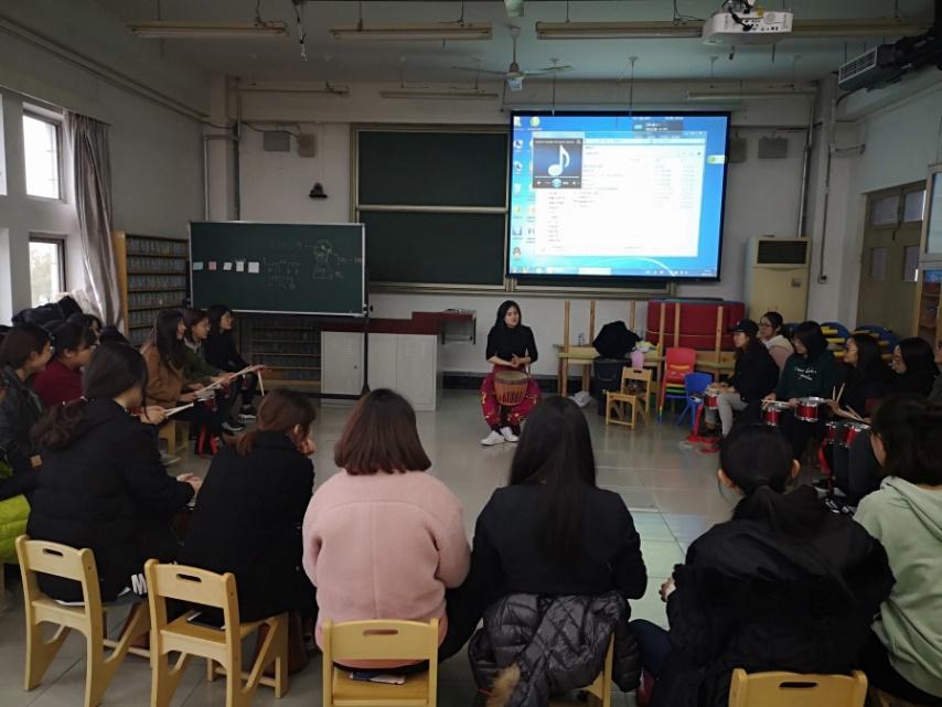 承擔此次實踐周非洲鼓教學工作的教師是魔笛教育機構教學主任、成立曼丁女子鼓隊,畢業于北京師范大學藝術系的賀老師,她有著豐富的非洲鼓教學經驗,也了解幼兒園的藝術教育形式。因此教學過程中經驗豐富的她從非洲鼓的文化淵源入手,引導學生了解這項民間藝術背后的故事、開展熱身活動,然后請同學們從坐姿到打鼓手勢一一練習,最后以分組匯報、競賽演出的方式調動同學們的學習熱情,帶領同學們進入親身體驗非洲鼓作為組織幼兒園藝術活動形式的可能,并鼓勵大家對這一表演藝術進行了點評。 相信通過此次的教學實踐活動,同學們在進行專業學習、就業面試時,開闊了視野,增加更多的自信和力量。