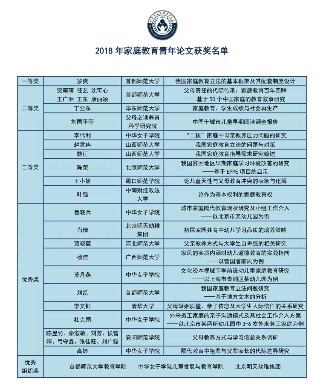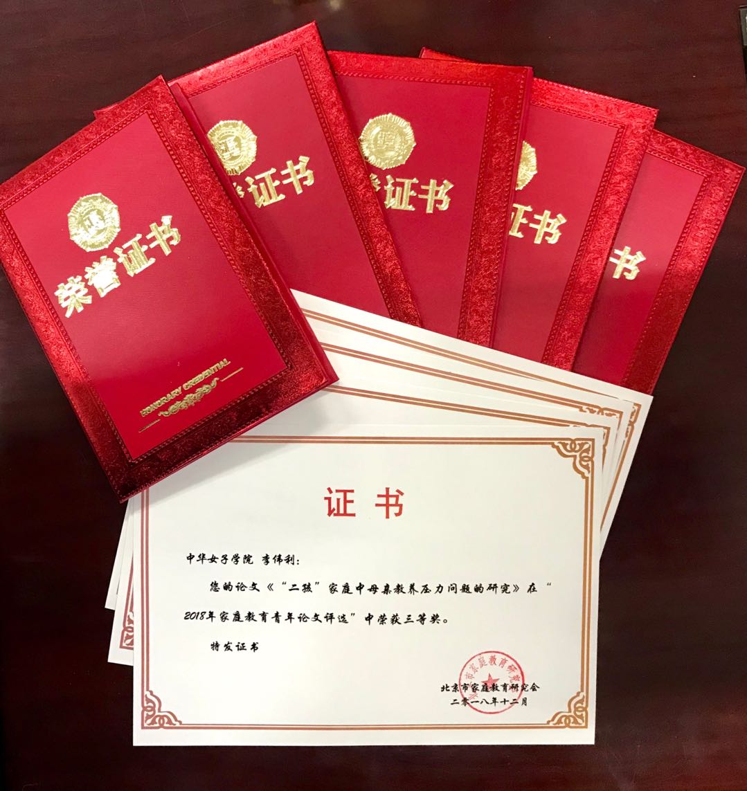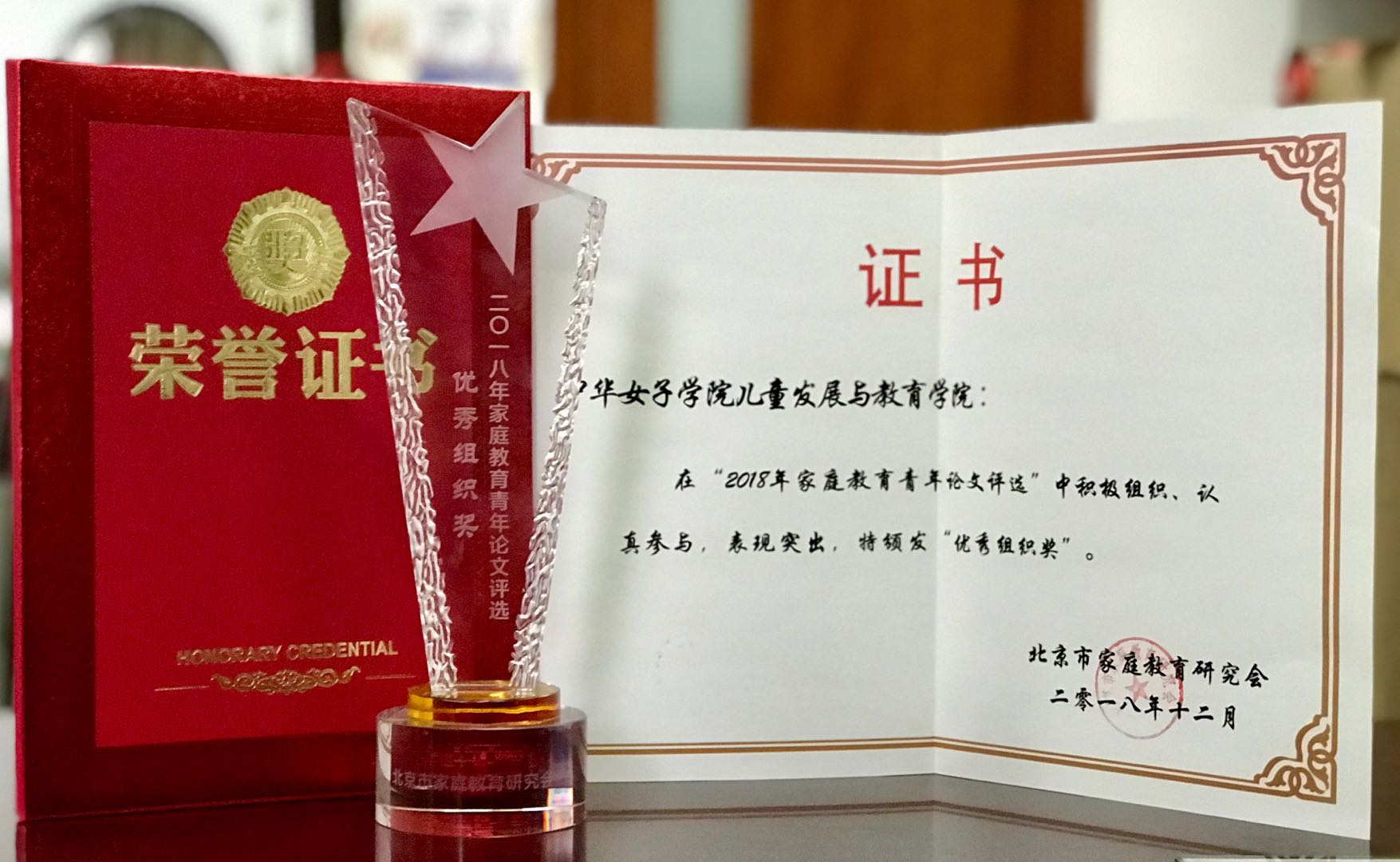 為推動家庭教育理論研究,建設完善家庭教育智庫,在北京市婦女聯(lián)合會、北京市教育委員會的指導下,北京市家庭教育研究會主辦的2018年家庭教育青年優(yōu)秀論文征集評選活動自啟動以來,收到了來自清華大學、北京師范大學、華東師范大學、首都師范大學、中華女子學院、河北師范大學、山西師范大學等15省市20余所高校師生,以及明天幼稚集團、父母必讀雜志社及眾多家庭教育指導中心、社會工作事務所等業(yè)內機構和社會組織等80余篇征文。本著公正公開公平的原則,由北京師范大學、首都師范大學、中華女子學院、中國教育報、北京市家庭教育研究會等7位專家組成評審團,采用匿名評審的方式,經過初審與現(xiàn)場終審,參照主題意義及創(chuàng)新性、研究方法運用、論證嚴密性、研究結果意義等四個維度,評選出20篇優(yōu)秀論文。中華女子學院兒童發(fā)展與教育學院推選的家庭教育本科與碩士畢業(yè)論文中,1篇論文獲得三等獎,5篇論文獲得優(yōu)秀獎,中華女子學院兒童發(fā)展與教育學院榮獲優(yōu)秀組織獎。