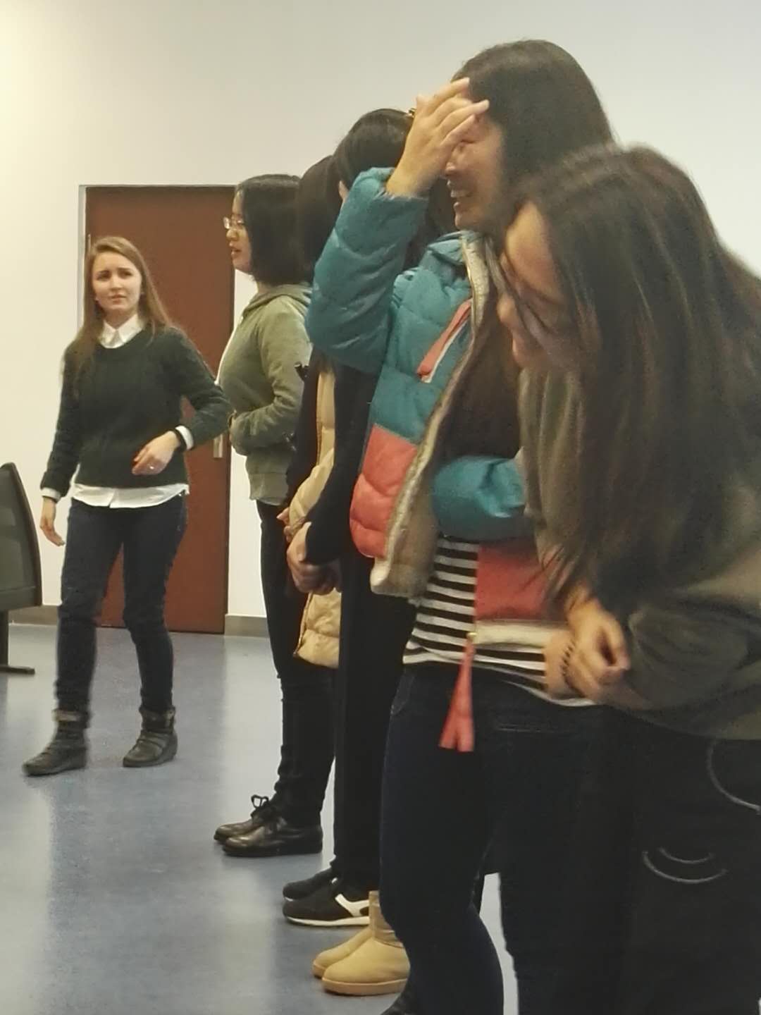 接著,可心老師帶著學生做了一個小熱身,老師請一些志愿者到臺上來夸張的表現他們的喜怒哀樂。大家站一排,從左到右,必須逐漸把感情放大、更加夸張。開始大家都有些放不開,但幾個回合下來,氣氛已經漸漸熱烈起來,接下來老師把所有人分成七個組,以小組的形式重復上面游戲,大家放開了,因為不是一個人,而是一群人,而且又新加入一些肢體動作,比如說擺手臂,扭腰等。大家非常興奮,老師又請所有人都來到臺上做游戲。按照她說的詞作相應動作,帶大家熟悉后,她又改變了游戲規則。結果大家做起來會顯得更加笨拙。后來老師告訴學生,她的目的是想要告訴學生要勇于接受挑戰新事物,走出自己的舒適區,盡管開始會很笨拙很尷尬,手足無措。