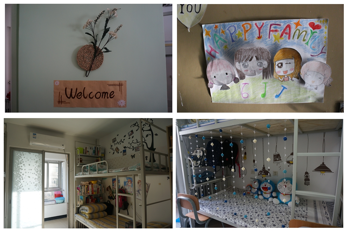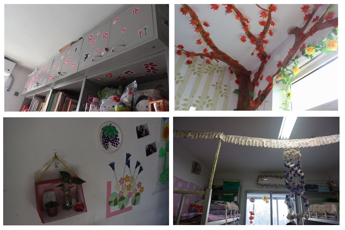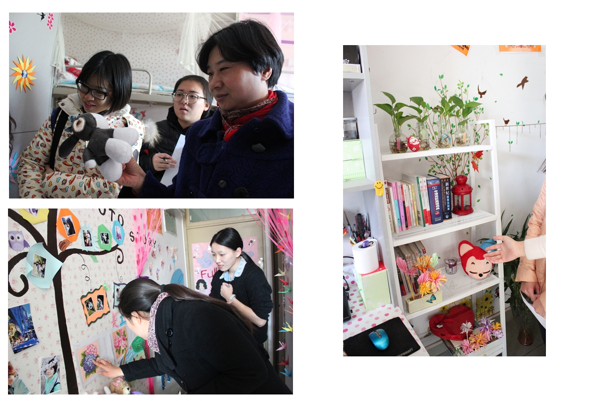 宿舍環境的參觀評比于12月1日中午進行,以現場評分的形式開展。為保證結果的公平公正,檢查工作小組成員由團學成員、班級生活委員和宿舍長組成,分為兩組分別為12級、13級的學生宿舍評分。兒童發展與教育學院巫曉蓮老師、龍春芳老師、楊多老師以及學校后勤處老師作為此次評選嘉賓出席。評比于中午12:10分準時開始,各參賽宿舍調動積極性,充分詮釋了什么是“沒有最美只有更美”,有的宿舍以綠色環保為主題,宿舍中所有裝飾物的資費都由回收空瓶子籌得;有的宿舍彌漫著墨香,宿舍墻上掛著宿舍成員的書法作品;還有宿舍的櫥柜上擺滿了自己縫制的手工玩偶,將幼兒園的環境布置成了宿舍小天地。本次宿舍文化節中展示的宿舍成員照片墻、精美的海報、手工小飾物,都體現出了宿舍成員的友情和團結,讓人眼前一亮。老師們肯定了所有參賽宿舍成員的努力成果,并說:“宿舍環境裝扮發揮了學前教育專業的特長,將幼兒園的布置特色帶入了宿舍中。一個干凈和溫馨的宿舍讓處在其中的人感到心情愉悅。”