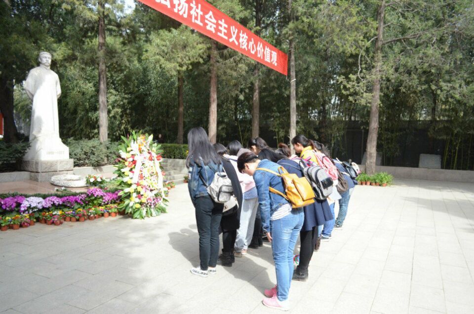李大釗烈士陵園座落于香山腳下的萬安公墓,活動前同學們進行了詳細的計劃,使本次活動進行的十分順利。在烈士墓前,同學們懷著敬意向李大釗烈士獻上白菊,大家肅然起敬,仿佛感受到那屹立于天地間巍峨和浩然正氣。同學們集體向李大釗烈士鞠躬三次,以表示同學們對烈士的無限懷念、崇敬與愛戴。