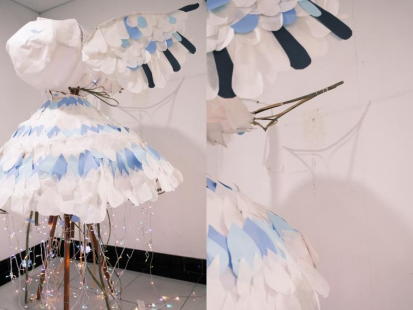 2024 級(jí)學(xué)前教育3班的作品“夢(mèng)”以《莊子·逍遙游》中“北冥有魚,其名為鯤”的古典意象為靈感,塑造了一條飛翔的鯤被一只夢(mèng)幻的大水母輕盈托舉,向著蒼穹進(jìn)發(fā)。“其翼若垂天之云”,暗合“鯤化為鵬”的浪漫想象。而水母的托舉則暗合《逍遙游》中鵬鳥需借“六月息”方能高飛的哲學(xué)內(nèi)核——個(gè)體的翱翔離不開集體、師友與時(shí)代的支撐。