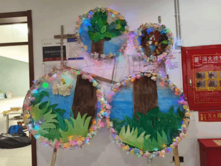 2024 級(jí)學(xué)前教育1班的環(huán)創(chuàng)作品以“林間”為主題,巧妙構(gòu)思了一系列圓形框架構(gòu)成的墻面裝飾,宛如一個(gè)個(gè)窺探自然奧秘的窗口。同學(xué)們用宣紙精心剪裁繪制出挺拔的樹木、如茵的綠草以及小兔子、小松鼠等可愛生靈,并以手工紙藝花卉和彩燈點(diǎn)綴框架邊緣,營(yíng)造出溫馨靈動(dòng)、充滿生機(jī)的氛圍。