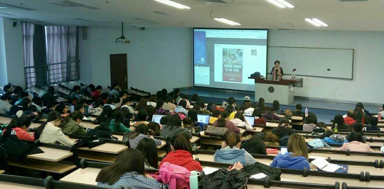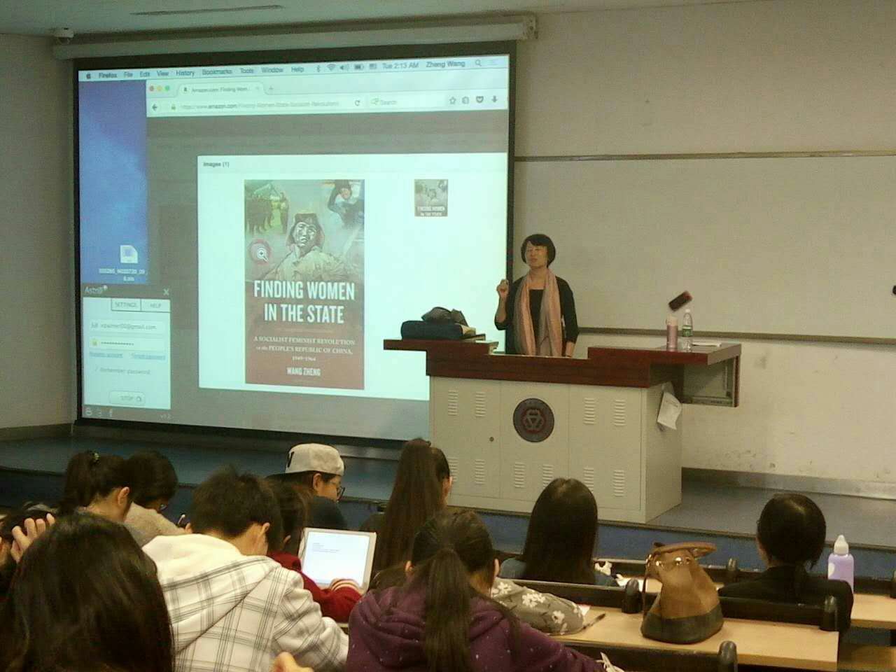 王政教授分享了其最新婦女理論研究成果《FINDINGD WOMEN IN THE STATE》,關于社會主義與婦女解放關系問題,她提出許多獨到的觀點。王政教授認為在社會主義初期,總共人數為53位女共產黨員為婦女解放事業所作的貢獻是不容忽視的,她們是中國最初的女權主義者。建國后,宋慶齡、鄧穎超等革命前輩創辦了婦代會、婦聯等促進婦女解放事業的國家機構,而后中國婦女事業也幾經波折艱難發展。當她回憶到出國前在上海為搜集婦女解放資料而連續一個月在圖書館手抄資料的經歷,讓我們對她的堅持和剛毅不禁感慨萬分。最后,王教授留出半小時時間與師生們進行互動交流,鼓勵我們要為未來婦女的進一步解放做貢獻。