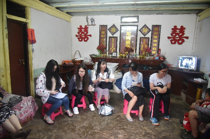 糯布村的入戶調(diào)查:糯布村隸屬云南省紅河州瀘西縣中樞鎮(zhèn),地處中樞鎮(zhèn)西邊,距鎮(zhèn)政府所在地8.00公里,該村現(xiàn)有農(nóng)戶660戶,其中從事第一產(chǎn)業(yè)人數(shù)1318人,主要貧困戶7家。入戶調(diào)查分為兩組,孫曉梅老師帶領(lǐng)郭欣宇、羅灣、熊佳玉、張蓉四位同學(xué)訪談三戶家庭,主要關(guān)注面農(nóng)村貧困地區(qū)留守兒童及留守老人的生存現(xiàn)狀。朱曉佳老師帶領(lǐng)趙艷宇、仝雨、周怡、王家娥四位同學(xué)訪談四戶家庭,主要關(guān)注留守婦女的生活現(xiàn)狀。兩組在村支書(shū)及其他村領(lǐng)導(dǎo)的帶領(lǐng)下深入村子分別進(jìn)行訪談。