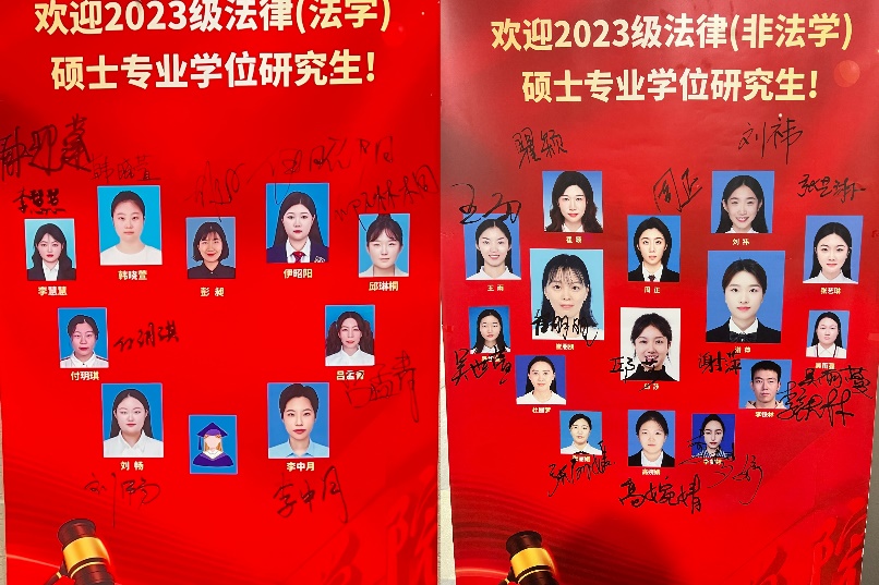 學院為新生準備了貼心和特色的歡迎活動。首先是拍攝新生報到時的視頻,記錄大家來到法學院的第一面。其次是邀請每位新生在印有自己照片的易拉寶上簽字,書寫來到法學院的第一筆。