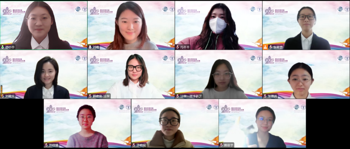 本屆比賽共有93支代表隊(duì)1000余名選手參加比賽,云集了北京大學(xué)、中國人民大學(xué)、清華大學(xué)、倫敦跨國法律研究中心(Centre for Transnational Legal Studies)、鹿特丹伊拉斯姆斯大學(xué)等國內(nèi)外名校,參賽規(guī)模再創(chuàng)歷史新高,競爭十分激烈,僅循環(huán)賽就多達(dá)180余場。女院法學(xué)院2020級本科生劉嘉文、張琳萱、張惠茜作為上場隊(duì)員參加口頭辯論,在循環(huán)賽中分別對陣外交學(xué)院、北京外國語大學(xué)、北京理工大學(xué)、北京郵電大學(xué)。