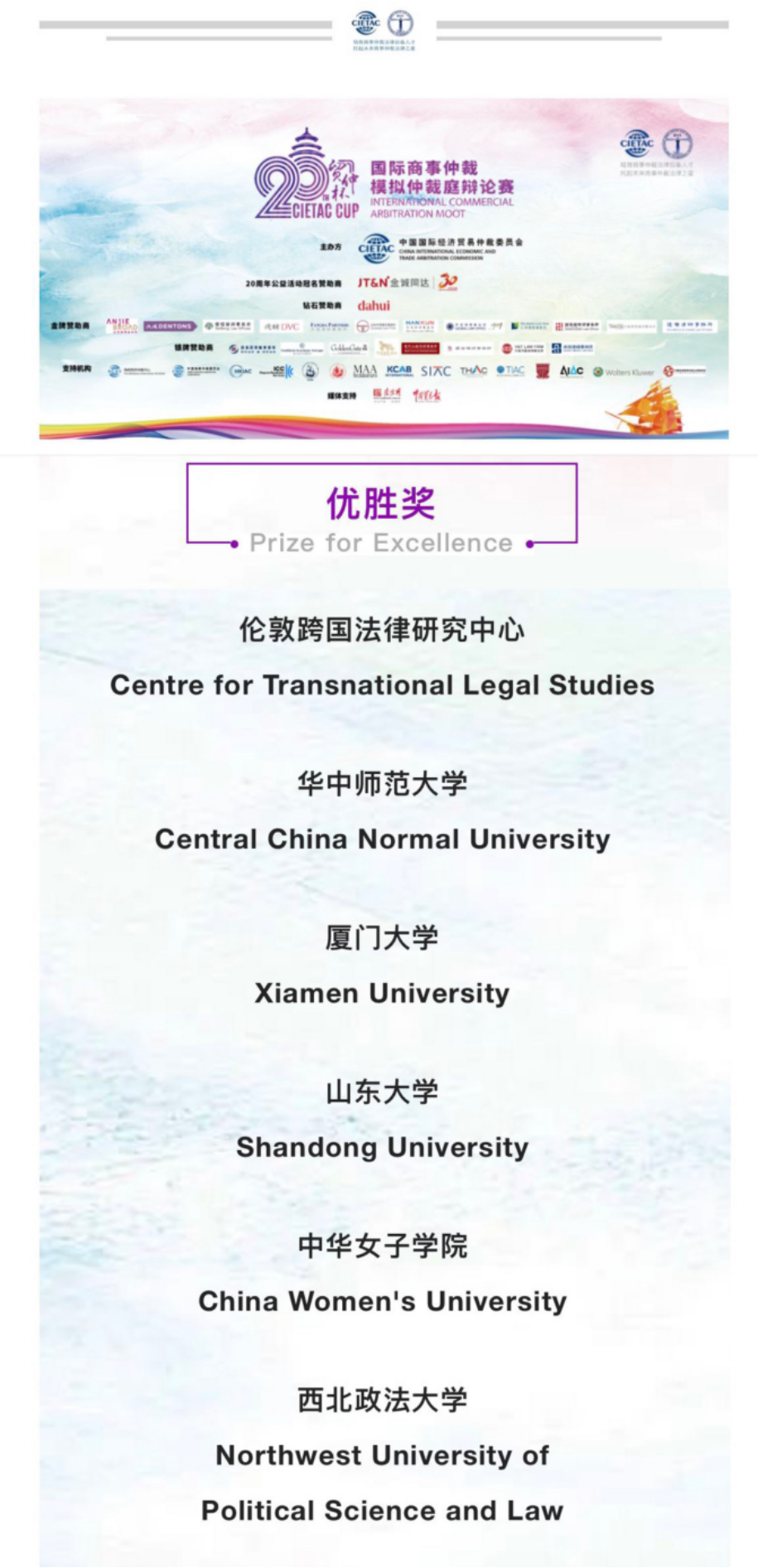 2022年11月28日至12月2日,由中國國際經(jīng)濟(jì)貿(mào)易仲裁委員會(CIETAC)主辦的第二十屆“貿(mào)仲杯”國際商事仲裁模擬仲裁庭辯論賽在線上舉行。經(jīng)過激烈角逐,中華女子學(xué)院代表隊(duì)從國內(nèi)外的九十三支隊(duì)伍中脫穎而出,榮獲優(yōu)勝獎。