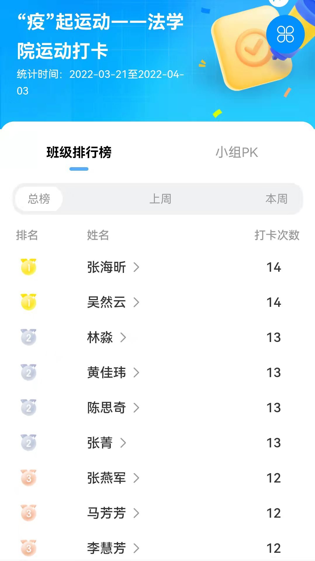 當前國內多地疫情形勢緊張,為響應疫情防控政策,保證同學們健康安全,學校采用了線上授課的教學方式。為充實同學們的網課生活,幫助同學們強身健體、調節情緒、養成時常運動的好習慣,法學院于2022年3月2日至2022年4月在線上組織開展了“疫”起運動打卡活動。