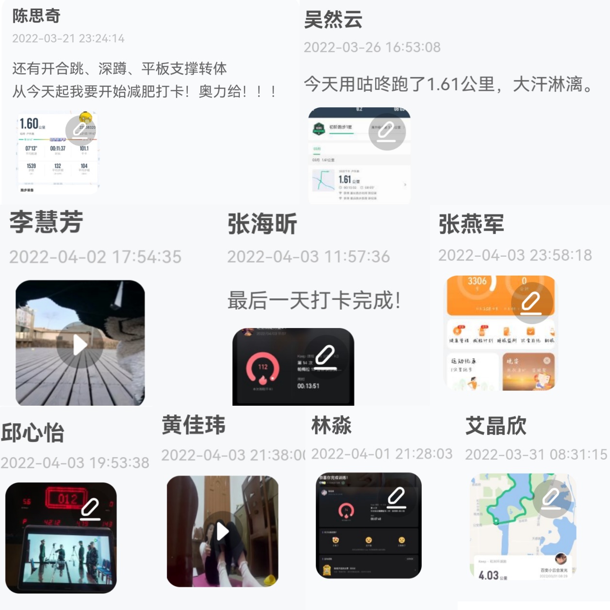 此次打卡活動中,同學們在符合防控要求的前提下,積極參與運動,運動結束后在班級小管家里通過照片、視頻等形式分享自己的運動動態。我們可以看到同學們會選擇進行戶外跑步,以此來鍛煉身體。也有一些同學因為疫情原因會在家做核心訓練、用跑步機跑步等,達到強身健體的目標。活動結束后,很多同學表示已經養成了每天運動的好習慣,并且還把這個運動習慣和理念傳達給了身邊的人。