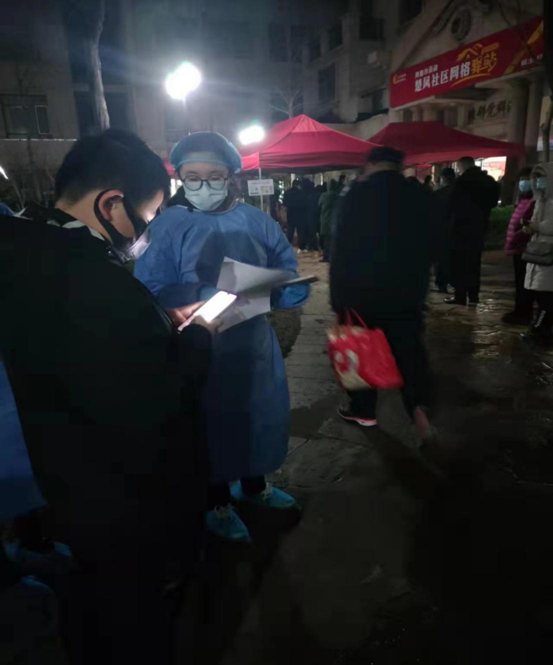 我院2019級來自河南信陽的蔡子宜同學(xué)主動申請,積極參與社區(qū)疫情防控志愿活動,在防疫點(diǎn)登記排查進(jìn)出人員、測量體溫、協(xié)查信息、衛(wèi)生消毒、維持現(xiàn)場秩序等。由于社區(qū)居民量較多,每日檢測人數(shù)達(dá)上千人,而志愿者卻嚴(yán)重不足,蔡子宜同學(xué)常常在寒冷的室外一站就是一整天,這讓她深刻地感受到了防疫工作者的艱辛與不易。