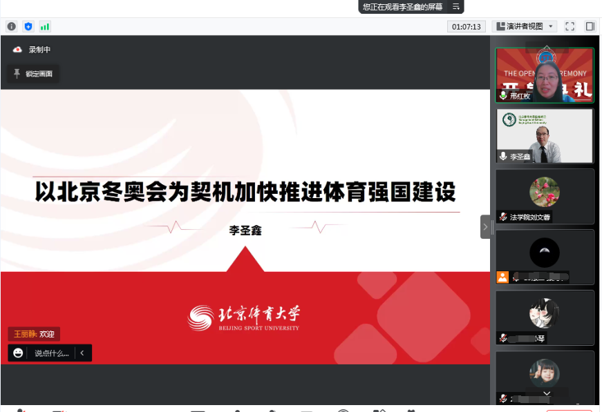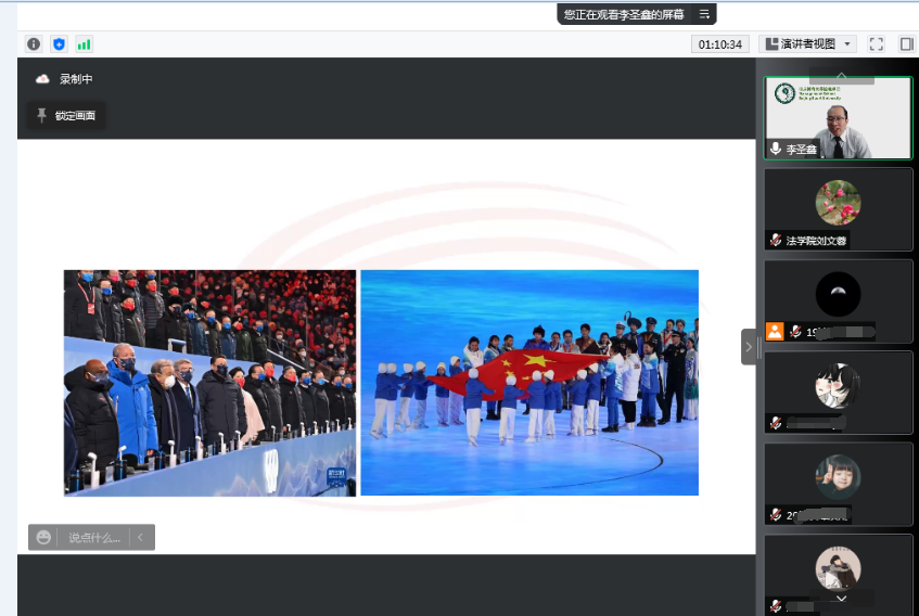 為了傳播奧林匹克知識,弘揚奧林匹克精神,作為法學院開學典禮的壓軸環節,法學院邀請到了北京體育大學管理學院副院長李圣鑫教授為師生們開展了題為“以北京冬奧會為契機加快推進體育強國建設”專題講座。李圣鑫教授通過2022冬奧會的申辦引出體育強國的內涵和推進,強調了冬奧會的成功舉辦對中國體育的發展具有重要意義。李圣鑫教授對于2022冬奧會申奧理念進行了解讀:“以運動員為中心,可持續發展,節儉辦賽”,這不僅讓參賽的各國運動員感受到真實、質樸的中國味,更讓中華文明同世界文明相交流、同奧林匹克精神相契合。李圣鑫教授指出,體育是社會主義現代化強國的重要組成,建設體育強國是現代化強國的重要內容,不能忽視體育在現代的作用,呼吁師生們加強體育鍛煉,培養健全的身體素質,希望未來能有更多的人參與體育、融入體育。
