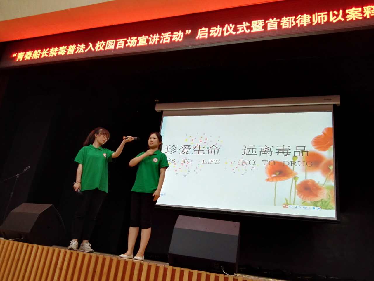 2015年6月19日下午,由北京市法宣辦、北京市禁毒辦公室、北京市禁毒教育基地、北京市律師協(xié)會、平谷區(qū)司法局等聯(lián)合舉辦的“青春船長禁毒普法入校園百場宣講活動啟動儀式暨首都律師以案釋法進校園宣講活動”在北京市平谷五中的大禮堂舉行。我校法學院 “青春船長”團隊參加活動并進行了現(xiàn)場宣講,獲得了各機關領導及平谷五中師生的一致好評。