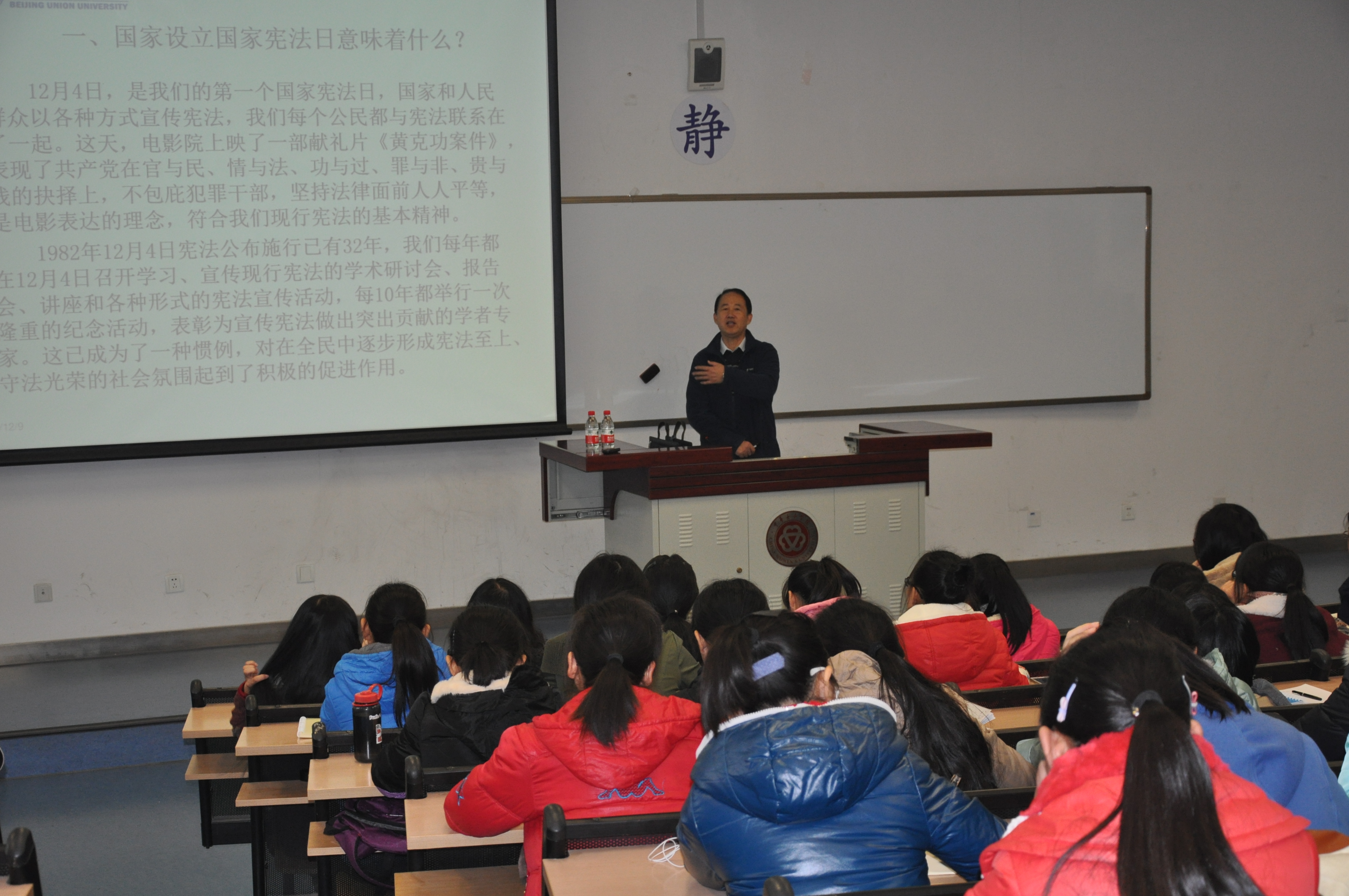 本次講座以“弘揚憲法精神 建設法治國家”為主題,主講人是中國憲法學研究會理事、北京市法學會憲法學研究會副會長兼秘書長張寶貴教授。他首先介紹了設立國家憲法日的意義,回顧了我們國家憲法建設走過的艱難歷程,用生動的事例全面解讀了我國現行憲法的主要內容和精神,講解了“依憲治國”在“依法治國”中的重要地位。講座結尾,張教授與同學們進行了互動,并鼓勵大學生們在學習期間就要樹立憲法意識,讓法治成為信仰,將來為建設法治中國盡一份力量。同學們對張教授精彩的演講報以熱烈的掌聲。