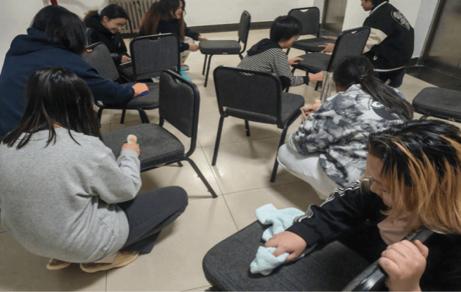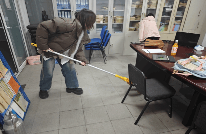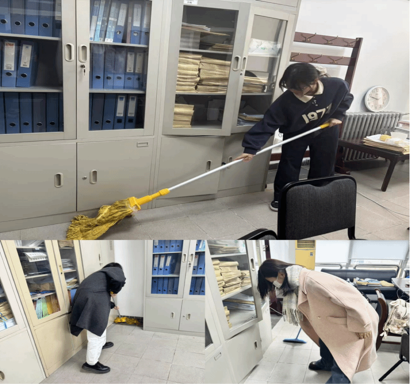 同學們滿懷熱忱,干勁十足。她們手持掃帚、抹布等各種清潔工具,仔細地清除會議室內的灰塵、污垢和垃圾,對會議室的椅子、桌子進行了仔細擦拭,確保每處衛生死角都能得到徹底的清潔。