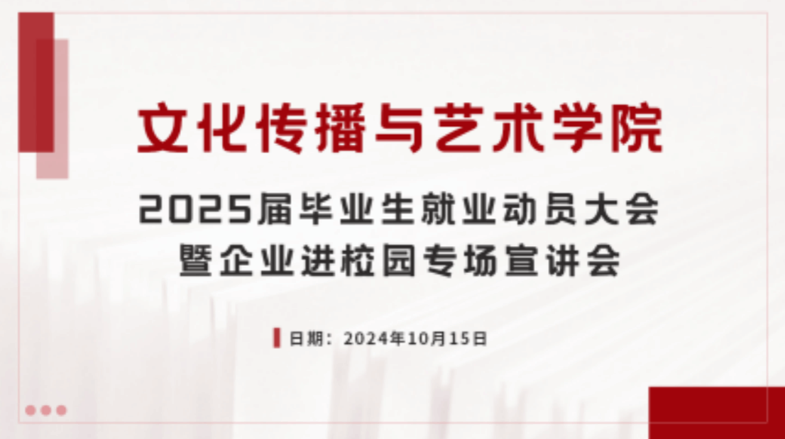 為助力2025屆畢業(yè)生從容迎接就業(yè)挑戰(zhàn),提前進行科學合理的職業(yè)規(guī)劃,10月15日文藝學院召開了2025屆畢業(yè)生就業(yè)動員大會暨企業(yè)進校園專場宣講會。就業(yè)指導中心主任程敏應邀參加,文藝學院黨總支副書記劉洪玉、學生科及2025屆全體畢業(yè)生參加了大會。