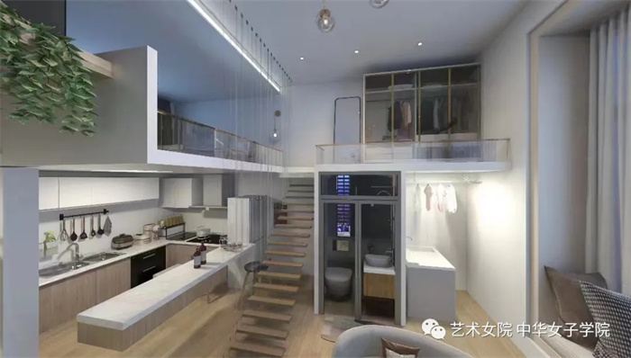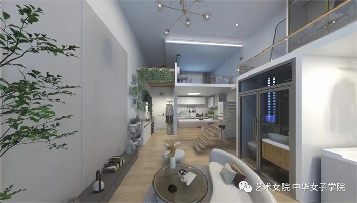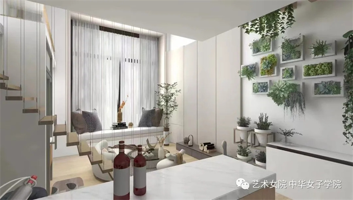 本案將綠植引入室內,通過設計將室內布置的更加綠色和自然,返璞歸真,回歸自然的設計理念。協調人與環境的關系。并強調垂直綠化在都市膠囊空間中,充分利用復式上空的布局特征。與此同時,設計選材上著重體現可持續應用的設計元素:新型生物塑料材料、再生材料,或是對環境影響小的環保建材等成為設計新寵。突出Z世代消費群的審美視角和價值觀念。