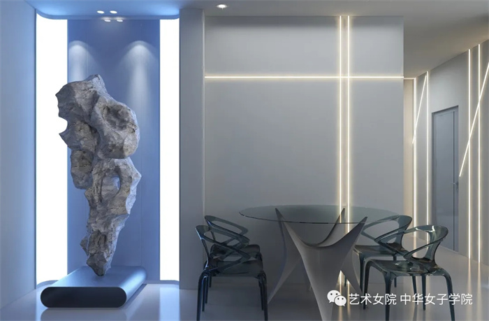 Z世代的家居融合了傳統與未來、詩性與舒適。“我和你共享的是整片星空,形形色色的我們在街道中,在霓虹下,始終抬頭便可共享星空。”空間整體色調以藍色為主,在門廳處放置的太湖石,其形態配合燈光可以更好的營造氛圍及呼應主題。家具和裝飾品多為環抱形狀,體現出雙方共享星空時的密切距離和溫暖。