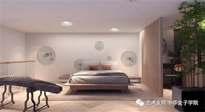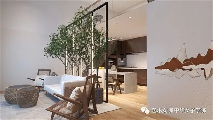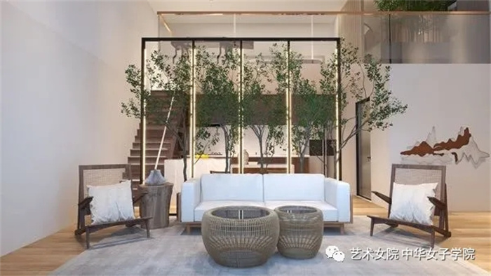 《從百草園到三味書屋》是魯迅先生的一篇回憶性散文,這篇散文正是我的靈感來源。在全文最后一句,暗示了作者的童真童趣的一去不復返。但我反而想留住這一份頗具童趣的回憶,于是在室內運用大量木制家具,意在營造出身處自然的氛圍感,仿佛身處有著高大皂莢樹、碧綠菜畦的百草園。客廳和臥室藤編的茶幾、衣柜讓人不禁聯想到冬天在百草園捕鳥的有趣場景。二樓臥室的墻面上的枯山水裝置與冬天百草園的雪景相呼應。