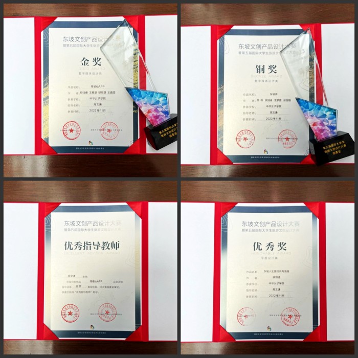 近日,我校文化傳播與藝術學院學生在“東坡文創產品設計大賽暨2022第五屆國際大學生旅游文創設計大賽”中斬獲多項佳績。本次大賽由海南省東坡文化研究與傳播中心、海南省旅游投資發展有限公司主辦,海南大學美術與設計學院承辦,評審團由國內設計界知名專家組成。經過科學嚴謹的初評、復評與終評環節,在眾多參賽優秀作品中,我校視覺傳達設計專業高文謙老師指導的學生作品《尋坡仙APP》榮獲大賽金獎、《東坡傳》榮獲銅獎,《東坡人生旅程系列海報》榮獲優秀獎;王文璐老師指導的學生作品《東坡志趣》、《東坡笠》榮獲“最佳網絡人氣獎TOP10”、優秀獎;高文謙老師獲評“優秀指導教師”。2月19日,大賽頒獎儀式及優秀作品展覽在海南省博物館舉行。
