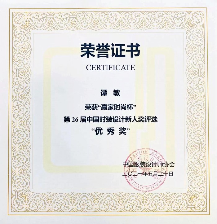 譚敏同學榮獲“贏家時尚杯”第26屆中國時裝設計新人獎評選優秀獎。