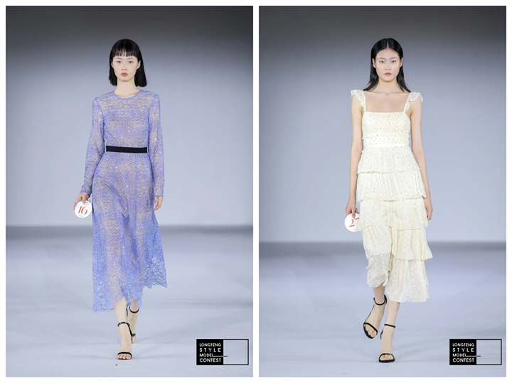 藝術學院表演專業20級學生周思含(左)、19級學生王詠琪(右)在“2021龍騰精英風尚模特大賽全國總決賽”中展示禮服。