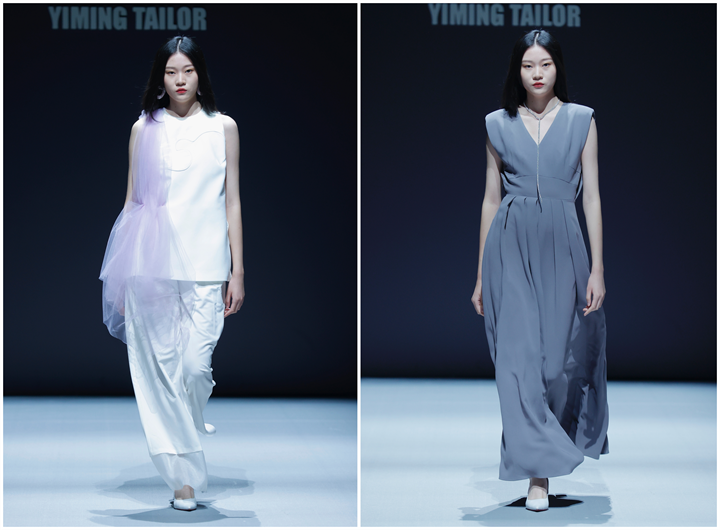 19級學生王詠琪在中國國際時裝周32 YIMING TAILOR品牌發布會秀場中。
