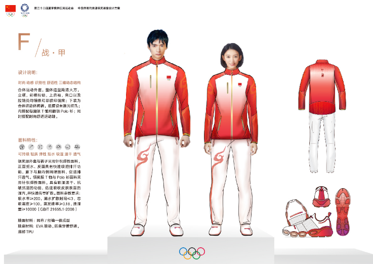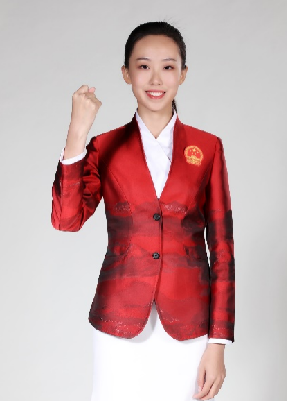 “星耀中國(guó)”系列設(shè)計(jì)兼顧儀式感與動(dòng)感,極具青春活力。色彩鮮明、簡(jiǎn)潔大氣的設(shè)計(jì)凸顯行走中運(yùn)動(dòng)員們的灑脫,舒適而不失端莊。本系列視覺(jué)亮點(diǎn)是黃底紅色星星在領(lǐng)帶與絲巾上活潑的運(yùn)用,來(lái)自國(guó)旗的視覺(jué)元素增加了服裝的焦點(diǎn)。男女上裝色彩形成內(nèi)外呼應(yīng),紅色男襯衫與紅色女外套彼此呼應(yīng),用白色的褲裝與裙裝進(jìn)行了統(tǒng)一,實(shí)現(xiàn)了統(tǒng)一中有變化,突出了團(tuán)隊(duì)整體活潑青春的形象。