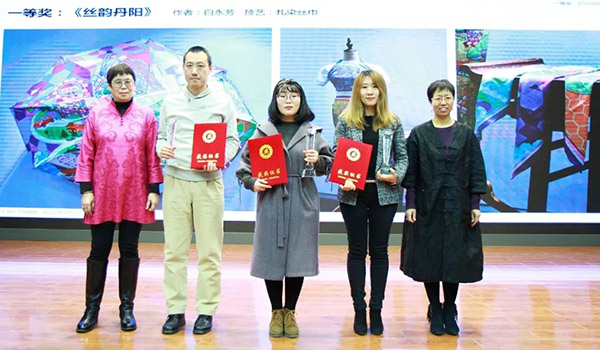 朝陽禮物創意大賽經過征集、評審、展覽、研討四個階段,歷時6個月的時間,共征集到200余幅作品,經過專家評審,最終評選出一等獎3個、二等獎5個、三等獎10個、優秀獎20個。中華女子學院藝術學院的非遺就業創業項目團隊巾幗天工負責人白永芳的絲巾作品《絲韻丹陽》獲得一等獎,東方采藍團隊王博祺、王月軒、柴詩雨、佟澤林、陳希的《藍染體驗套裝》設計獲得三等獎,山海學塾團隊袁嘉雯、王雨竹、施妍冰、解姝雅、劉澍敏、何金玲的《朝陽禮物包裝》設計獲得優秀獎。一等獎獲得者、我院非遺創業畢業生白永芳代表獲獎嘉賓發言,分享了她在非遺創新設計方面的心得體會。
