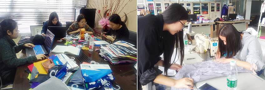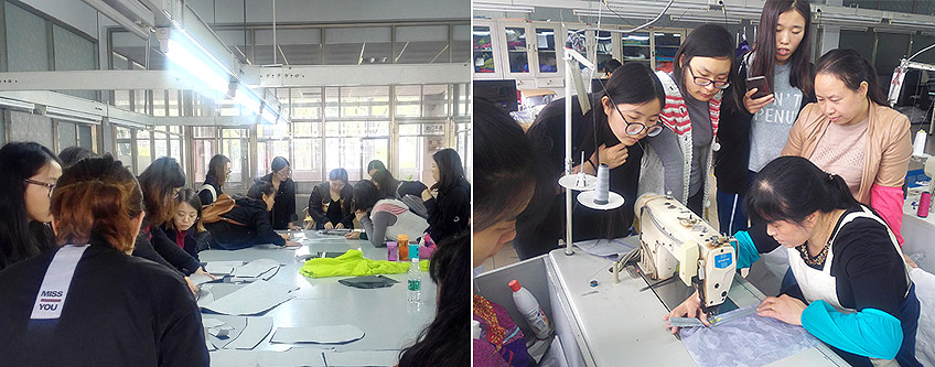 近五天的實習日程安排非常緊湊充實。學生們與工廠職工一起吃住一同上班,全方位參觀了服裝工廠的各個車間和科室,觀摩了流水線服裝生產的制作流程和現代化管理模式,并且觀察收集了戶外運動裝的特殊面輔料的應用,以及特殊工藝要求下的服裝機械的用法。不僅如此,在短短的實習中,學生們還進行了實際上機操作,以小組的形式協作完成了運動裝樣衣的制作。通過親身制作體驗,進一步夯實學生內容。樣衣制作時,學生們邊學邊做,遇到不會的地方就及時到流水線去向有經驗的職工請教取經,技術科的工人姐姐也非常樂意地來示范解惑。