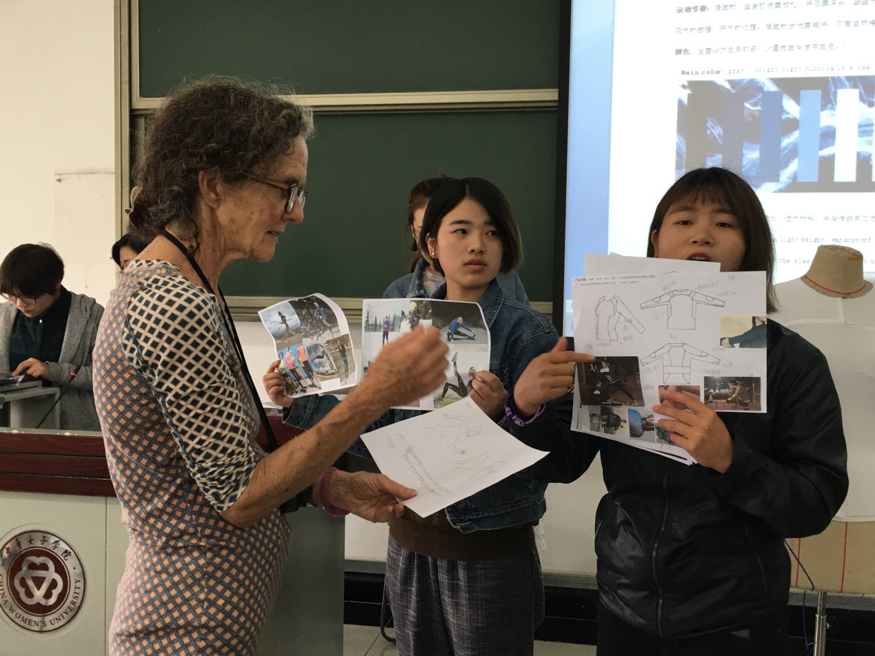 Jane McCann教授以國際化的設計理念和視野,為同學們精心設計了教學內容和學習任務。在高強度的教學中讓同學們快速掌握了如何進行設計研究、設計分析以及如何進行團隊合作與陳述交流的方法和技巧。細致深入地啟發學生們從包容性設計和可持續性設計等環保理念出發去做服裝設計構思。同學們分組對騎行、慢跑、徒步、瑜伽、街頭運動等具有代表性和市場潛力的運動方向進行了設計探索。課前完成了充足的調研,課上進行陳述與交流。結合調研內容,針對具體需求和問題進行了設計實踐,特別針對運動人體的板型進行實驗,通過動態分析,板型轉換的方法感受運動裝設計與時裝設計之間的區別。
