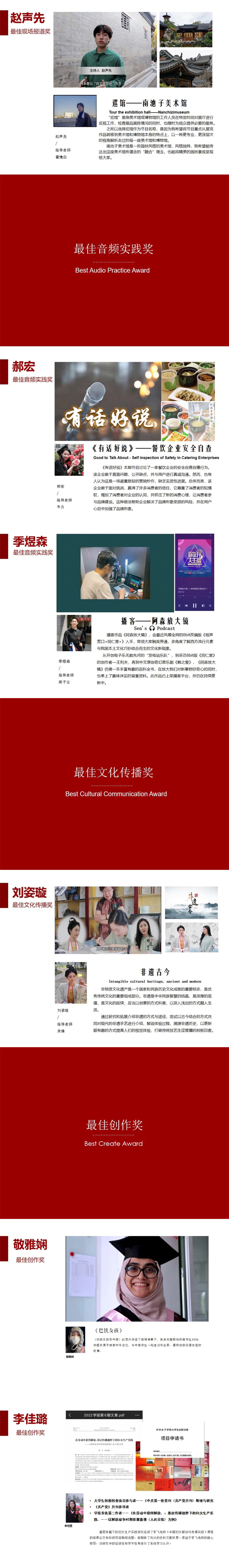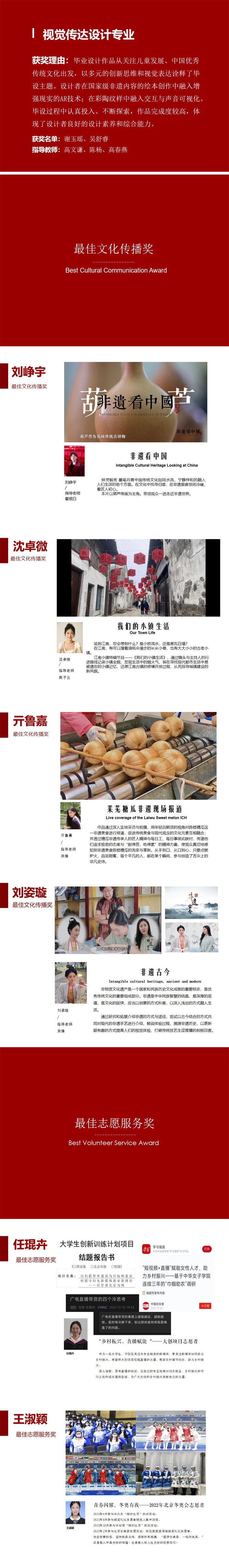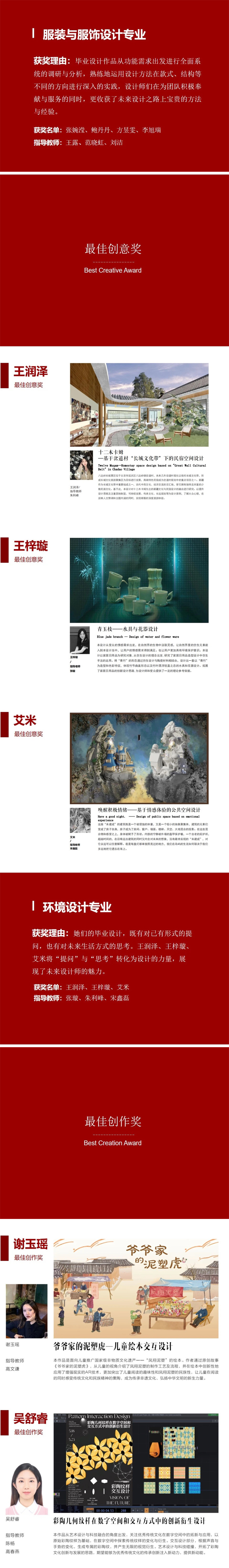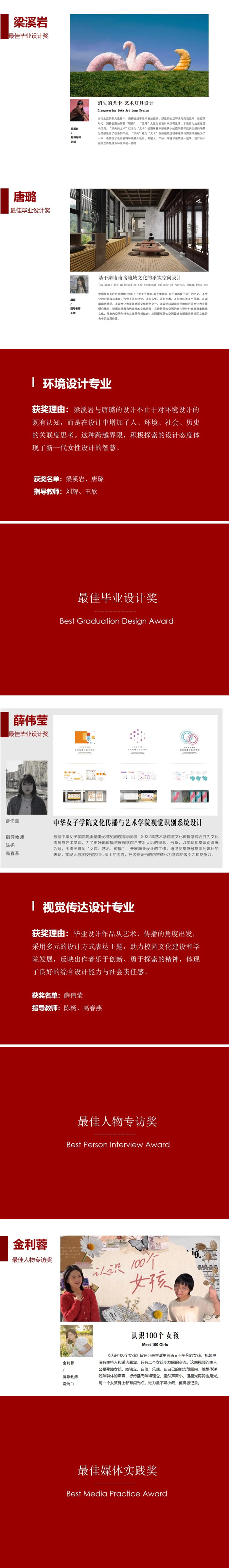 此次評選,共46名同學(xué)獲獎,其中一等獎11名,二等獎16名,三等獎19名。獲獎同學(xué)分別來自服裝與服飾設(shè)計專業(yè)、環(huán)境設(shè)計專業(yè)、視覺傳達設(shè)計專業(yè)、服裝表演專業(yè)、播音與主持藝術(shù)專業(yè)、網(wǎng)絡(luò)與新媒體專業(yè)。校領(lǐng)導(dǎo)和專業(yè)指導(dǎo)老師們?yōu)楂@獎的優(yōu)秀畢業(yè)生們頒發(fā)了榮譽證書。祝賀獲獎的同學(xué)們,希望他們在未來的道路再接再厲,實現(xiàn)美好的青春夢想。