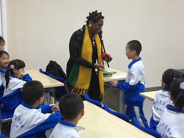 得知小訪客們要到來參觀的消息,國際留學生們從幾周前就已經開始報名,準備和中國小朋友們進行跨文化交流。從報名的留學生中選出了兩組來接待小訪客。來自牙買加的學員用彩色圖片展示的形式向大家介紹了牙買加的風土人情,從植物動物一直到食品和節日,小朋友們都聽得津津有味。另一組是來自馬拉維的三位學員,她們精心地準備,分別身著黑色、紅色和綠色的衣服和鞋子,來代表馬拉維國旗的顏色,甚至將自己頭發染成了相應的顏色。在她們熱情的表演、解說和帶動下,大小朋友們大手牽著小手,在2010年南非世界杯主題曲的音樂中,歡樂自由的舞動著非洲文化特色舞蹈。