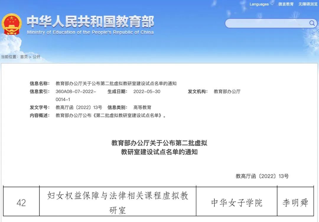 學(xué)校“婦女權(quán)益保障與法律相關(guān)課程虛擬教研室”獲批教育部第二批虛擬教研室建設(shè)試點(diǎn),獲得教育教學(xué)成果獎(jiǎng)、本科教學(xué)改革創(chuàng)新項(xiàng)目、優(yōu)質(zhì)本科課程和教材課件、優(yōu)秀本科育人團(tuán)隊(duì)、第十二屆高校思想政治理論課教學(xué)基本功等多項(xiàng)本科高層次教育教學(xué)類成果。