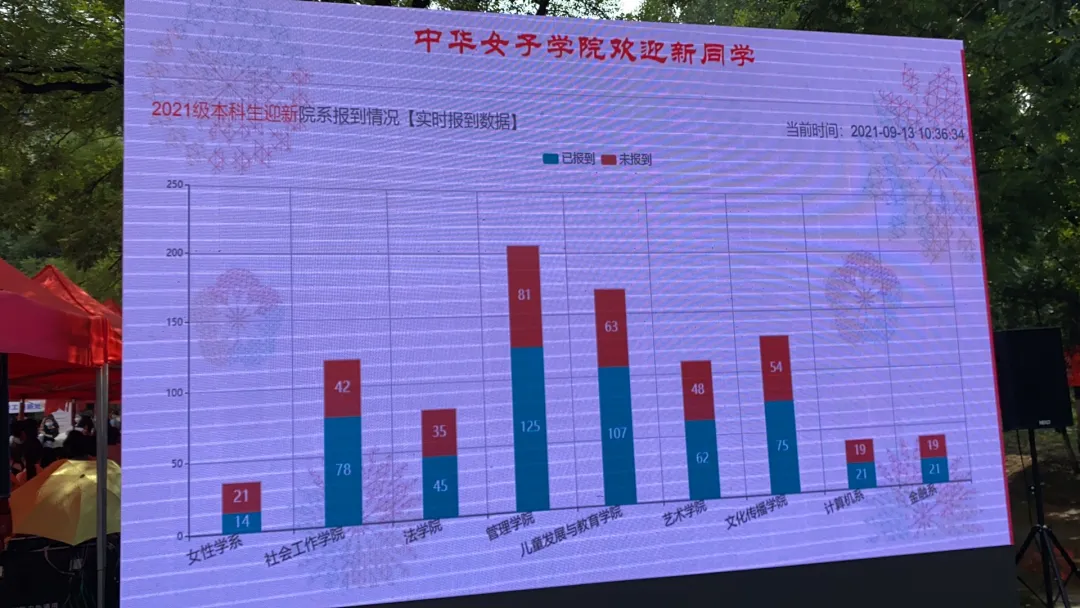 滾動的大屏幕能夠實時顯示報到人數、報到名單及分布,報到情況可以同時在手機的迎新系統中同步查看。