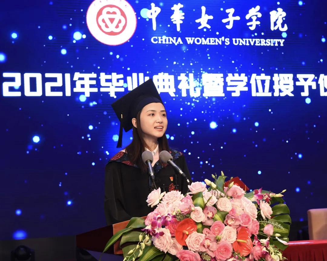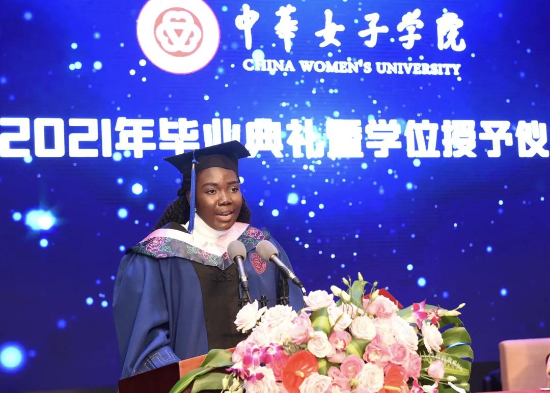來自加納的援外學歷學位碩士研究生國際學員代表普林西斯發言。她代表援外班畢業生感謝中國政府、商務部獎學金秘書處、全國婦聯和中華女子學院,感謝在新冠肺炎疫情期間給予同學們另一個家,做同學們的堅強后盾。特別是女院在疫情期間的付出、愛和關懷令同學們難忘,也教會同學們鼓起勇氣,面對困難和挑戰。感謝學校指明的人生道路,培養并激勵女性,為她們賦權。作為從中華女子學院畢業的女性領導者,畢業后與學校,與校友之間的聯系將永存下去。當回到各自的國家,她們將成為知識的傳播者、友好的見證者。