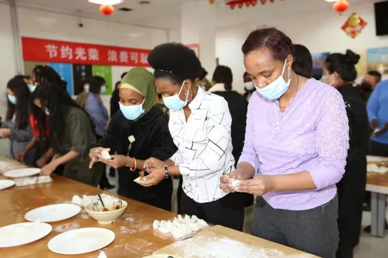 這次慰問活動中的學包餃子,正是留校國際學生校園文化主題活動周的組成部分。在活躍留校學生校園文化生活的同時,我校積極落實疫情防控要求,提前了解所有參加活動人員的健康狀況,餐桌上放置隔離擋板,全體活動人員除吃餃子環節外,全程佩戴口罩,并提醒保持一定的社交距離,確保活動暖心、安全。