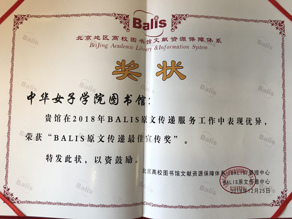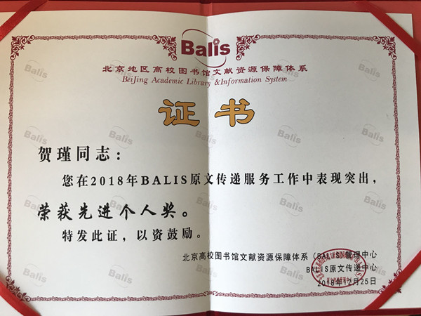 在北京地區90余家參評圖書館中,我校圖書館綜合排名第23位,并且繼2017年后再次榮獲“BALIS原文傳遞最佳宣傳獎”,賀瑾館員獲得“BALIS原文傳遞先進個人獎”。