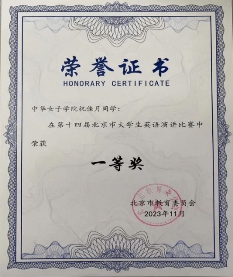 2023年11月18日,第十四屆(2023)北京市大學生英語演講比賽復賽、決賽在對外經濟貿易大學舉行,我校2022級播音與主持藝術專業祝佳月同學與來自北京大學、清華大學、中國人民大學、北京外國語大學等49所北京高校的49名優秀選手同臺競技。祝佳月表現突出,經過激烈角逐,最終位列亞軍,喜獲一等獎,創我校學子參加該賽事以來的歷史最好成績,為學校贏得了榮譽。