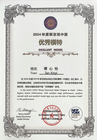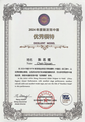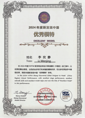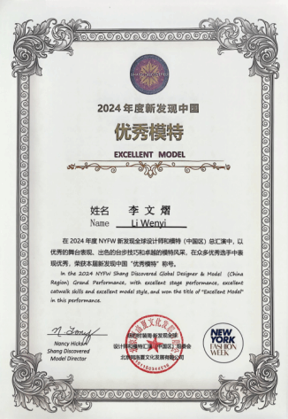 2024年度NYFW新發現中國“優秀模特”獲獎證書