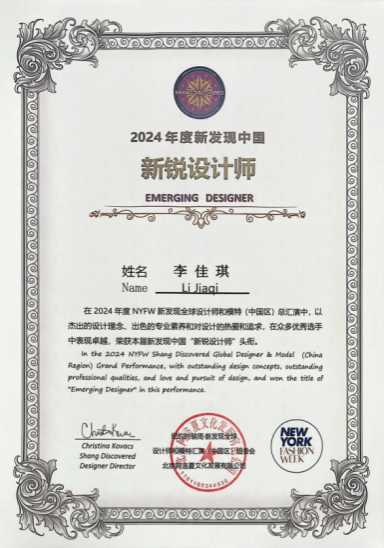 2024年度NYFW新發現中國“新銳設計師”獲獎證書