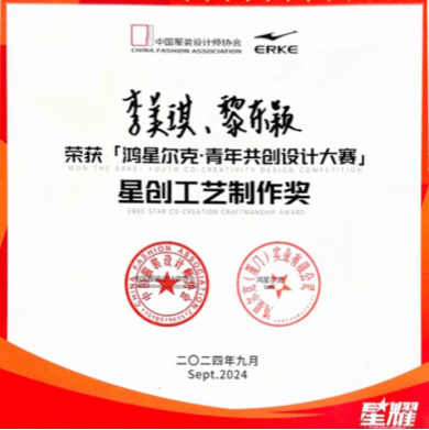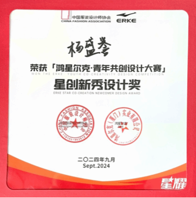 在剛剛落幕的“2024鴻星爾克·青年共創設計大賽”中,2022級服裝與服飾設計專業李美琪同學榮獲星創工藝制作獎,2021級服裝與服飾設計專業楊盛譽同學榮獲星創新秀設計獎。他們的設計作品充滿無限想象力,展現了中國設計新銳力量對于運動在不同環境下功能與創新的理解,詮釋了未來運動時尚的多樣性與包容性。