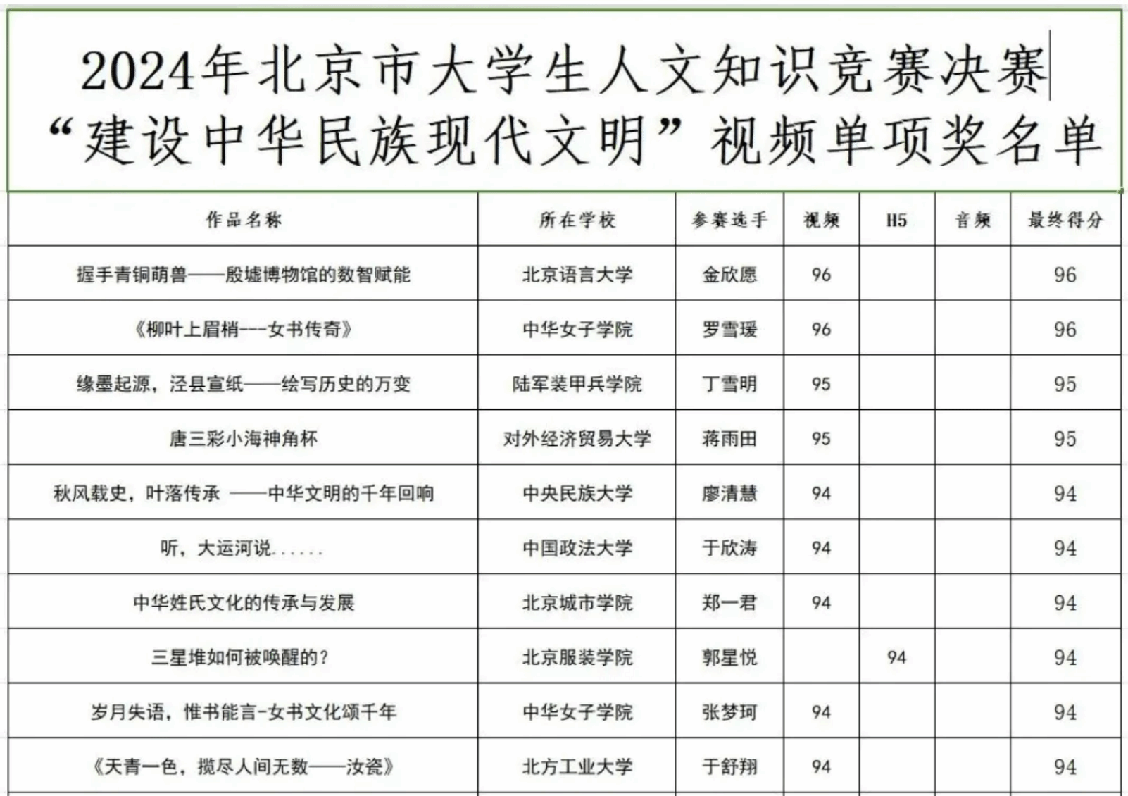 日前,北京市大學生人文知識競賽組委會公布了2024年北京市大學生人文知識競賽個人賽決賽綜合成績評獎名單和2024年北京市大學生人文知識競賽個人賽“古詩創作”及“建設中華民族現代文明”視頻單項獎名單。來自我校國際教育學院、管理學院、兒童發展與教育學院、婦女發展學院、法學院、社會工作學院等院系的14人次獲得北京市人文知識競賽的一、二、三等獎及視頻單項獎。這些喜人成績不僅展示了女院學子的人文素養與精神面貌,同時也彰顯了學校在立德樹人、人文教育方面的實踐成果。