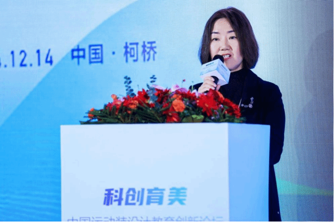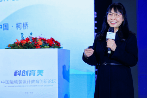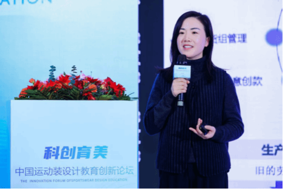 王露教授進行了《用戶驅動的運動裝設計創新探索》的演講。她指出面對運動服裝及裝備在全球的巨大市場空間,中國運動裝企業應抓住用戶需求轉向個性化、專業化和可持續化的機遇進行創新和升級。運動裝設計創新方法是以用戶需求為驅動,包含探究、創新和評估的系統性科學性的設計流程,流程對運動裝設計課程的教學設計、教學理念與方法有著指導性作用。她從運動裝設計創新理念、實踐教學平臺的合作與育人成果幾方面,生動地介紹了中華女子學院服裝與服飾設計專業如何將“科技與藝術、時尚與健康、包容與可持續”的跨學科設計教育理念融入創新人才培養,以及國家級一流本科專業建設的階段性成果。