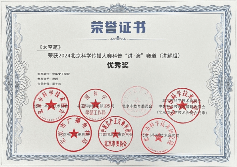 近期,2024北京科學傳播大賽圓滿落幕,我校喜獲優(yōu)秀組織獎,播音與主持藝術專業(yè)2023級本科生楊超的作品《太空筆》獲此次大賽講演賽道優(yōu)秀獎,播音與主持藝術專業(yè)教師周子云獲優(yōu)秀指導教師獎。